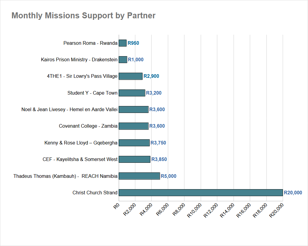 Our church council also recently approved an inflation increase of about 6% on average to all our financially-supported partners. Together with the new support to Kairos and Churches for Namibia, this brings the total financial support to our missions partners to R47,850 per month, or R574,200 per year.